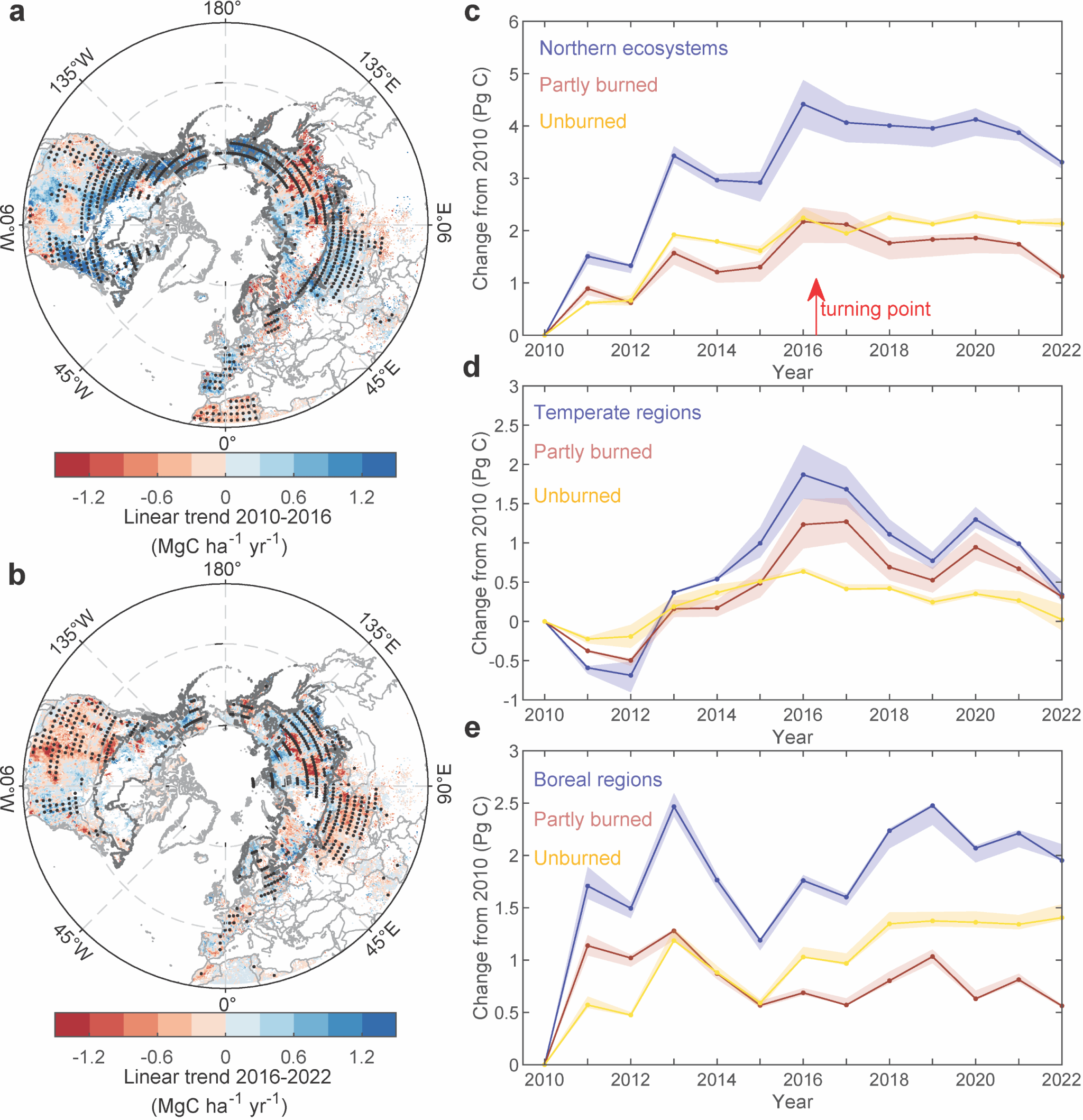 北半球(30°N以北)生态系统占全球森林面积的约41%,每年为陆地碳汇贡献14至20亿吨碳,在全球碳循环中具有重要作用。过去半个世纪,受二氧化碳浓度上升和气候变暖影响,中高纬地区植被生长季延长、生产力提高,光学遥感显示“变绿”趋势明显,因此普遍认为北半球植被碳储量持续增加。然而,近十年间,该区域频繁遭遇高温、干旱和火灾等极端气候与扰动事件,进而引发气候变化热点问题:北半球植被碳储量是否仍在增加,亦或已发生转折?其背后的驱动机制又是什么?