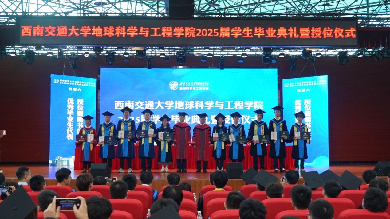 2025届员工毕业典礼暨授位仪式圆满结束后,同学们与毕业班辅导员老师一同上台,在“地学英才,引航未来”“竢实扬华,自强不息”的口号声中留下了青春大合影。祝愿2025届全体毕业生在人生的新赛道上,心系“国家事”,肩扛“地质责”,手执“测绘笔”,胸怀“消防志”,以专业所学服务时代所需,以青春之我筑家国之梦,跑出属于交大地学人的加速度,在广阔天地中绽放属于自己的光彩!