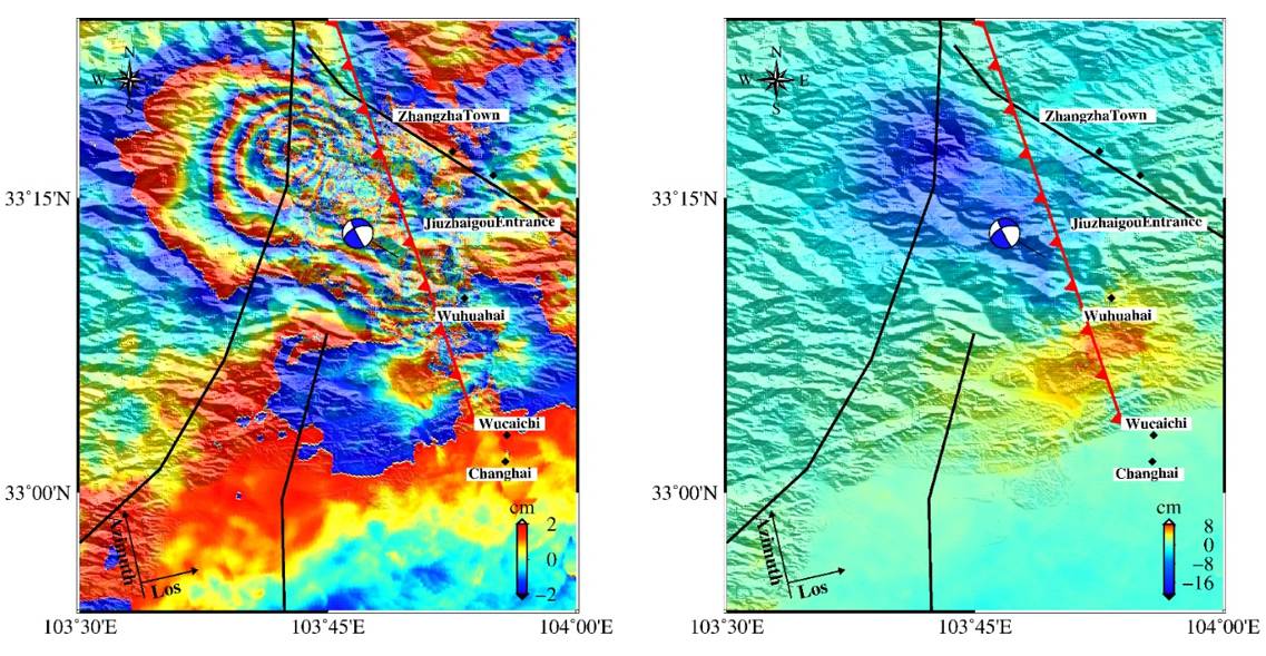▲图1. 九寨沟地震Sentinel-1A升轨干涉相位图(左)及形变场(右)