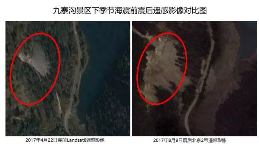 ▲图5. 九寨沟景区火花海震前震后遥感影像对比(震后水面浑浊,部分水域干涸见底)