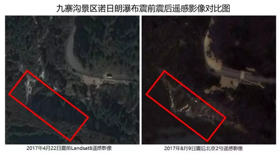 ▲图6. 九寨沟景区诺日朗瀑布震前震后遥感影像对比(震后岩体坍塌,造成岩块大面积堆积,瀑布水量明显减少,多处出现断流)
