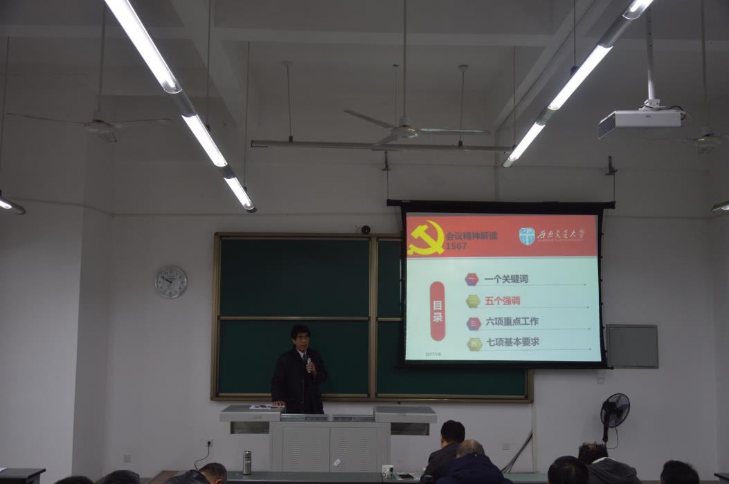 大会进行第二个阶段。首先王齐荣书记分别从一个关键词、五个强调、六项重点工作、七项基本要求四项基本内容传达学习高校思政工作会议精神。王书记重点讲到,走中国特色社会主义高等教育发展道路,要同我国发展的现实目标与未来方向紧密联系在一起,始终坚持为人民服务,为中国共产党治国理政服务,为巩固和发展中国特色社会主义制度服务,为改革开放和社会主义现代化建设服务,不能照搬、复制国外的培养模式。同时,王书记介绍了党在系班子里的重要性,要做到支部与行政工作很好地结合。关于寒假前后公司安全工作要求,王书记分别从加强安全检查和管理,层层落实工作责任、加强安全教育,强化安全意识、加强值班和信息报送工作三个方面提出了工作建议,并要求各部门按时严格落实。