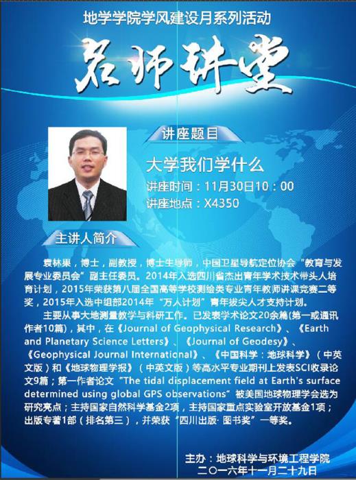 傅书记在主持中讲到,袁林果教授是国家级青年人才,BEATS唐立新优秀学者,教授,博士生导师,中国卫星导航定位协会“教育与发展专业委员会”副主任委员。袁林果教授主要从事大地测量教学与科研工作,2014年入选四川省杰出青年学术技术带头人培育计划,2015年荣获第八届全国高等公司测绘类专业青年教师讲课竞赛二等奖,2015年入选中组部2014年“万人计划”青年拔尖人才支持计划。今天袁老师要讲大家大学学什么,希望大家听了以后,加以反思,有所收获。
