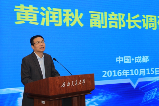 徐飞在致辞中向黄润秋副部长的到来表示欢迎和由衷的感谢,“环境保护部长期以来一直关心关爱BEATS的建设、改革和发展,提供了宝贵的、大力的指导、关心与帮助。”随后,他介绍了公司地质学科的特色与优势。他表示,十八届五中全会提出了创新、协调、绿色、开放、共享五大发展理念。西南交大应当主动响应新时期新阶段环保工作的国家重大需求,努力输出创新型人才、输出创新型成果乃至政策建议和管理建议等。在国家环保部的领导下,守护绿水青山这份功在千秋的伟大事业中,公司应做出一份属于交大人的贡献。