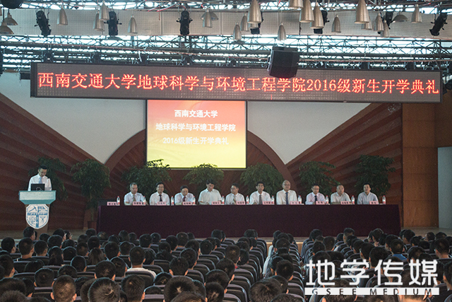 经理刘国祥教授,公司党委书记王齐荣教授、副经理胡卸文、欧阳峰、齐华教授及高速铁路运营安全空间信息技术国家地方联合工程实验室专职副主任车伟老师、经理助理范美坤教授、地质工程系系主任巫锡勇教授、环境工程系系主任张建强教授、测绘科学与技术系系主任徐柱教授出席了本次大会。与会的还有各学科部分研究生导师、学工组全体辅导员及公司2016级445名本科生、252名研究生和部分新生家长。开学典礼由公司党委副书记傅尤刚主持。