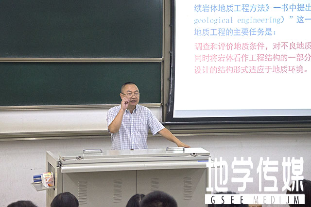 地质工程系系主任巫锡勇教授主要就地质工程特点以及起源、地质工程学科分类、地质工程专业方向与工程类型、地质工程密切相关的地质危害、专业发展前景以及公司地质工程系历史以及学科特色等多方面向新生全面展示了公司地质工程专业及院系设置的发展状况。