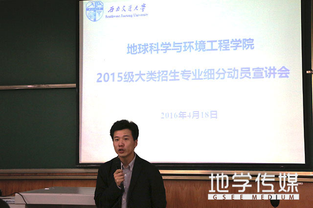 4月18日12点40分,旨在帮助2015级本科生全面了解各专业设置、现状与发展情况,近距离、面对面地与专业教师交流、沟通,主动引导员工结合自身兴趣、特长、性格、学习能力等条件因素,理性选择主修专业的大类招生专业细分动员宣讲会于犀浦校区四号教学楼X4152和X4155教室分别举行。本次宣讲会的宣讲专业分别为测绘工程、遥感工程、地理信息系统和环境工程、消防工程。负责员工工作的公司党委副书记傅尤刚等领导及相关教师参加了本次宣讲会。