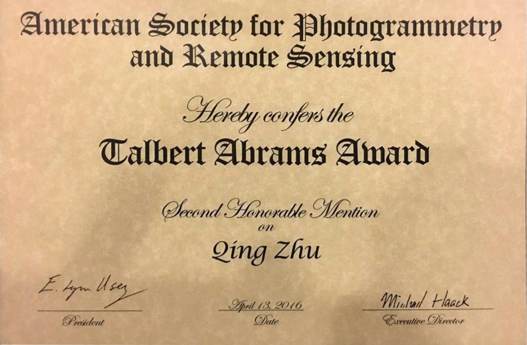 朱庆教授团队的论文荣获2016年度ASPRS学会塔尔伯特·艾布拉姆斯奖