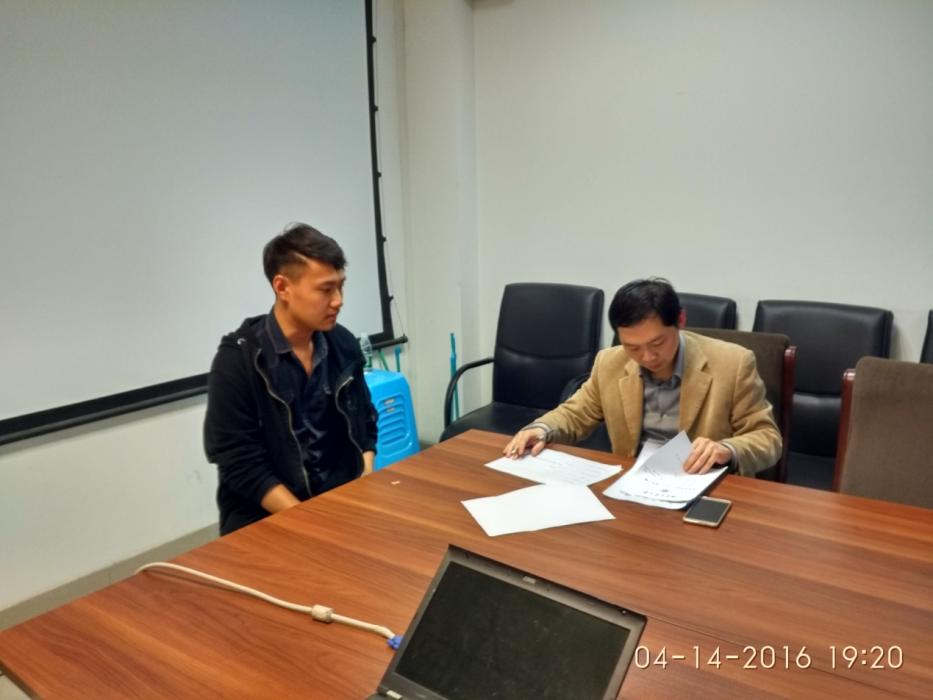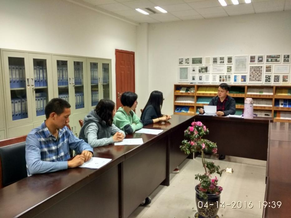 2016年4月14日晚上7点,测绘系2016年本科毕业论文中期检查专家面谈工作在X4546、X4433、X4431举行。检查工作邀请到测绘、地信及遥感三个研究方向的教师袁林果、周乐韬、黄泽纯及慎利进行现场指导工作。专家面谈采取一对一或一对多的灵活形式,专家从论文进展、外文翻译、指导纪要、程序编写等方面对每位员工进行提问,较好地掌握了员工论文的进展情况,对进展缓慢的员工论文,提出了限期整改的要求。此次专家面谈工作较好地保证了我系本科毕业论文的质量。