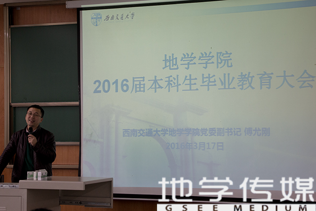 大会一开始,傅老师首先对大四的同学进行了就业动员。他带领大四员工回顾了大学的四年光阴,并鼓励同学们能够认真完成毕业设计,祝福考研的同学们复试顺利,也期待毕业生能够找到自己适合的工作,以崭新的面貌、昂扬的斗志,开启人生的新篇章。接下来,傅老师结合《BEATSBEATS本科生在读期间安全责任告知书》的具体内容着重强调了安全事项,他希望同学们在这最后几个月的时间里依然注意安全、遵纪守法,文明离校。同时他也交代同学们纵使离别之情依依不舍,也要遵守校规校纪,注意控制自己的情绪、严禁在校园里大声喧哗、酗酒闹事。最后傅老师对2016届即将毕业的地学学子送上了最衷心的祝福与祝愿。