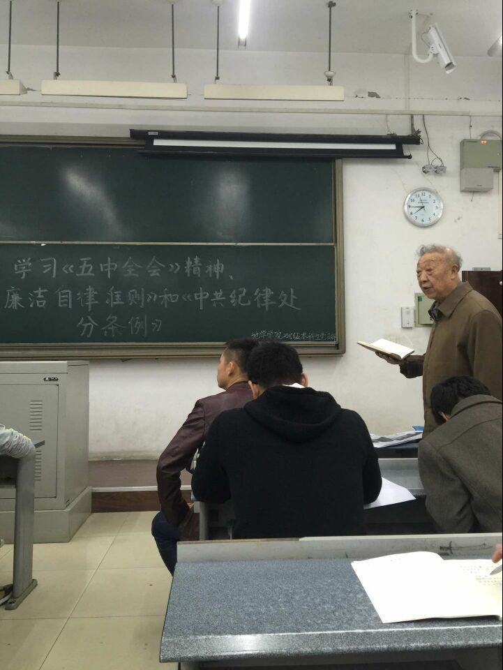 为了让同学们更加了解共产党的政策方针、清正廉洁的重要性及严守纪律的必要性,提高同学们的入党积极性,加深对党执政的认识并培养一名先进共产党员应具备的优秀品质,发挥优秀党员的先锋模范作用。2015年11月10日晚7:00,​2015级本科生党支部成员在X7101召开“懂规矩,守纪律”主题活动——学习十八届五中全会精神、《中国共产党廉洁自律准则》和《中国共产党纪律处分条例》。会议邀请到了组织员刘冠军老师,党支部书记孙彦文老师主持会议。