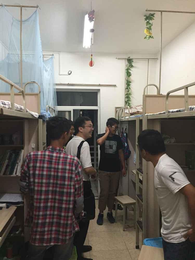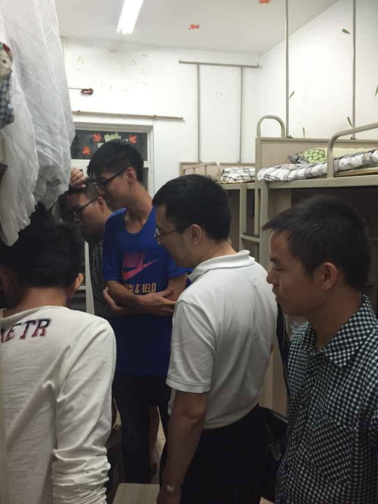 傅尤刚副书记和孙彦文老师一边认真地察看寝室内的水电、门窗等安全设施,一边亲切地与同学们拉家常,嘱咐假期留校的同学要注意水电安全,出入时关好门窗,加强国庆假期期间的防火防盗等安全意识;嘱咐假期回家的同学注意路上安全;并殷殷告诫同学们不要辜负大学四年最美的青春年华,勤奋学习,严于律己,学好专业课,远离网络游戏的诱惑,同时要互相督促,共同做好寝室的内务整理及公寓整体环境卫生的保持。最后傅尤刚副书记还饶有兴致地向同学们发起“寝室装潢大赛”的倡议,让同学们展示自己的设计才能,最大限度地美化寝室,让公寓展现百花齐放的魅力,此倡议得到了全体同学的热烈响应。