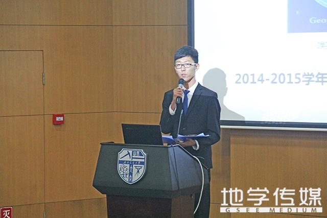最后登台的是12级博士班地质工程专业的冯君学长。身为博士的冯学长,他的超强学术科研能力从他不多的言语中就得以体现。他的针对大学新生要“作风踏实,转变心态,勇于创新”的告诫令我们受益匪浅。