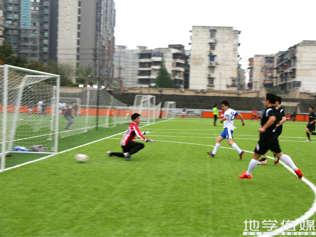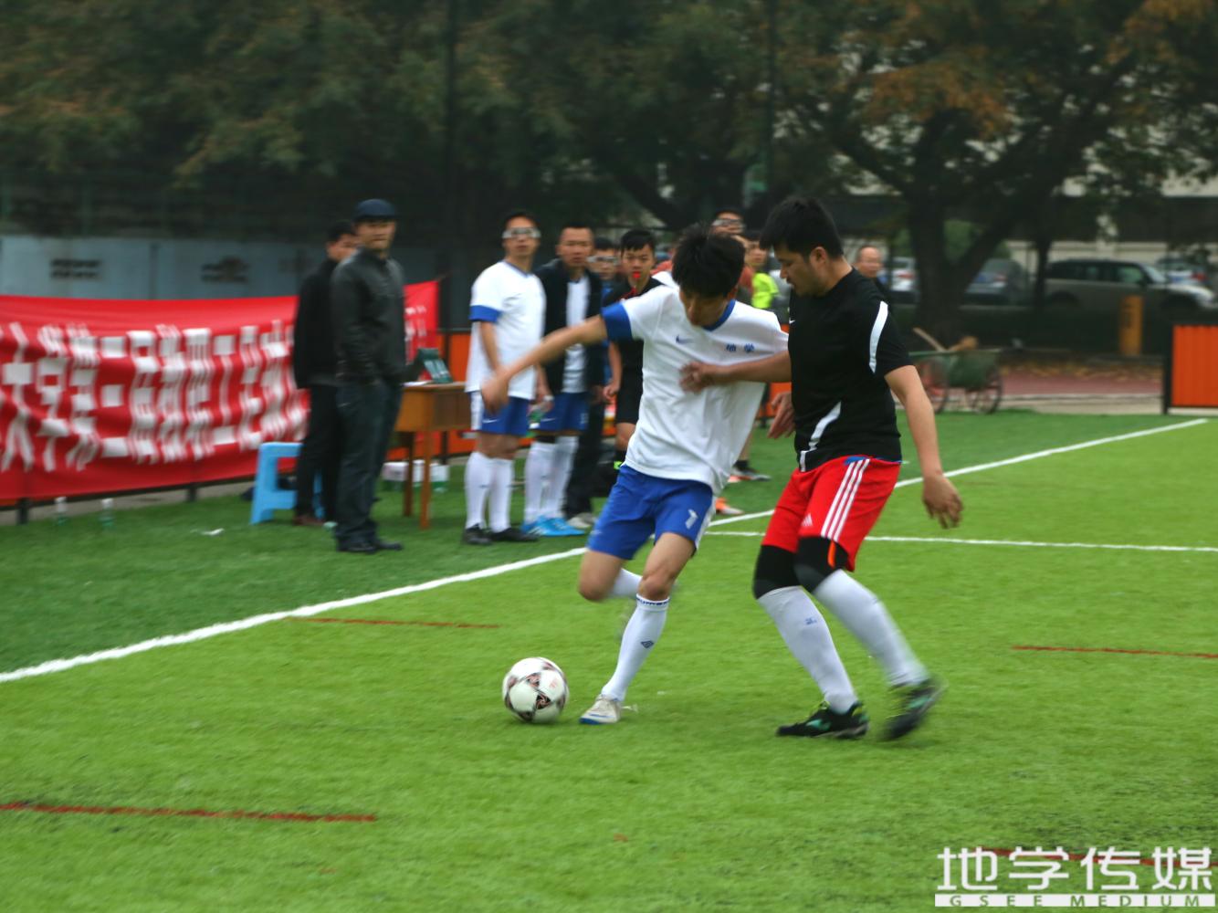 下半场开始,天气愈加恶劣,远程队也展开积极的进攻,几次带球到后场对地学队造成威胁。正是最困难的时候,地学队在中场获得一个任意球机会,由队长刘了主罚,一脚精彩的吊射,从球门上角吊入,扩大了比分。这一球的攻入了更鼓舞了全队士气,队员之间的配合也更加默契。队员间通过二过一的方式带球到后场,有的队员在中场带球奔袭,或者后卫在中场把握机会远射,射手们在球门前也有鱼跃、冲顶倒钩的表现。而BEATS的守门员作为球队最后的铁壁,诺伊尔附体,大脚解围对方的单刀,扑出对方各种刁钻的射门。到了下半场的中间时刻,远程队后卫处理球时出现迟疑,被BEATS队23号断球,并又打进了一球。比赛结束的哨声响起,地学4-0战胜远程,BEATS队23号陈建奇打入3球,上演帽子戏法。