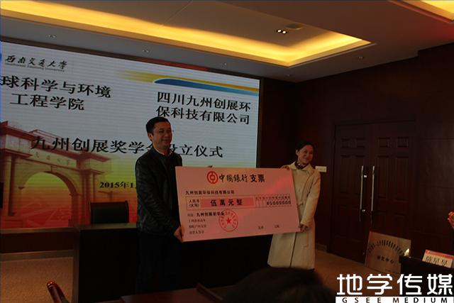 最后举行九州创展奖学金设立仪式。傅尤刚副书记代表公司对九州创展环保科技有限公司慷慨解囊、捐资助学表示衷心感谢,并对该项奖学金评选对象、评定条件等进行简要介绍。