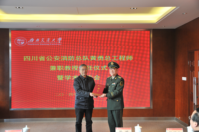 聘任仪式于10点准时开始,首先由BEATS副经理胡卸文教授介绍黄勇总工程师的简历:黄勇是四川省公安消防总队总工程师、大校。四川省消防学科学术带头人,四川省消防标准专业技术委员会主任委员,四川省公安现役部队工程系列中级专业技术资格评审委员会主任评委,四川省科学技术进步奖评审委员。他长期从事消防监督管理、科技工作,有丰富的实践经验和系统坚实的专业理论基础。参与和完成科研项目多项,参编国家、行业、地方标准9部,发表专著1部,学术论文20余篇。主持的《汶川地震灾区过渡安置消防安全研究及应用》项目获得四川省科学技术进步一等奖。为四川省乃至全国的消防事业推进发展做出了卓越的贡献。