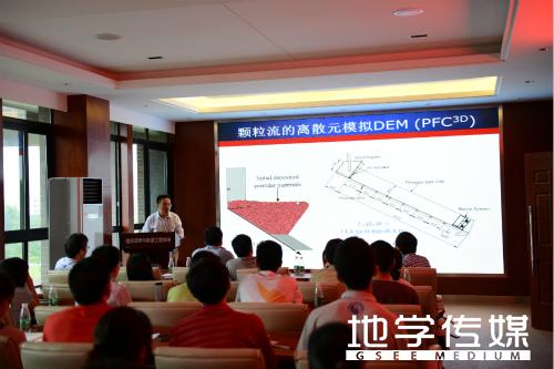 几分钟的休息之后,周公旦副研究员围绕“碎屑流运动特性和数值模拟”展开了讲述。首先,周副研究员说明了传统的连续介质模型没有考虑侧向约束力、地表侵蚀以及摩阻力和剪切速率的关系三个方面的确定。然后,阐述了怎样运用理论分析和水槽实验、数值模拟(离散元DEM)相结合的方法,研究碎屑流的流变特性,描述碎屑流剪切速率对床面(基底)摩阻力的影响,对颗粒流运动模型(Savage-Hutter)模型和数值计算模型进行了详细的解说。最后,与同学进行了亲切的互动。