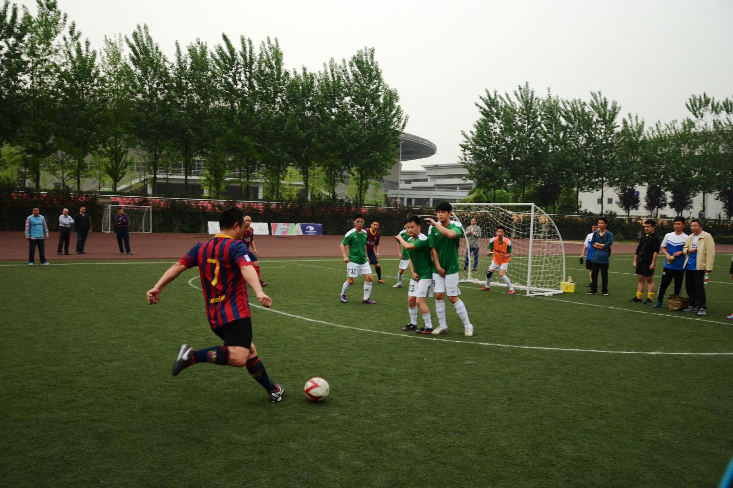比赛进入下半场,我方改变战术,以攻为守。球员们数次射门,虽未收获,却也造成了气势上的压制。然而交运公司代表队不甘示弱,抓住我们的一个漏防空档,带球侵入禁区,后卫19号忙中出错,禁区拉人犯规,被判罚点球。有惊无险的是,校队前门将出生的19号球员苏凯老师迅捷反应将点球扑出,33号球员何刘老师一个巧妙的头球将球顶出界外,成功解围。虽然,对手制造了几次定位球的机会,但面对公司教职工足球队强大的防御阵型,始终无法突破我方大门。