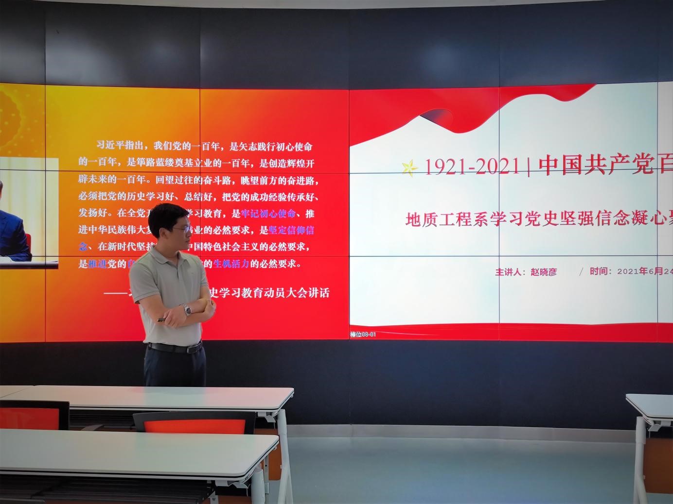 赵晓彦同志带领大家一起学习了中国共产党百年辉煌历史。赵晓彦将中国共产党的百年历史分为了4个阶段,与地质系支部党员们一起学习。