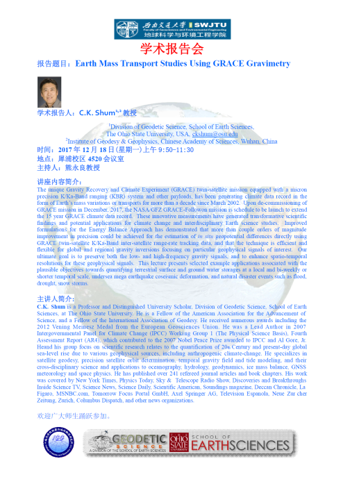 C.K. Shum is a Professor and Distinguished University Scholar, Division of Geodetic Science, School of Earth Sciences, at The Ohio State University. He is a Fellow of the American Association for the Advancement of Science, and a Fellow of the International Association of Geodesy. He received numerous awards including the 2012 Vening Meinesz Medal from the European Geosciences Union. He was a Lead Author in 2007 Intergovernmental Panel for Climate Change (IPCC) Working Group 1 (The Physical Science Basis), Fourth Assessment Report (AR4), which contributed to the 2007 Nobel Peace Prize awarded to IPCC and Al Gore, Jr. Heand his group focus on scientific research relates to the quantification of 20th Century and present-day global sea-level rise due to various geophysical sources, including anthropogenic climate-change. He specializes in satellite geodesy, precision satellite orbit determination, temporal gravity field and tide modeling, and their cross-disciplinary science and applications to oceanography, hydrology, geodynamics, ice mass balance, GNSS meteorology and space physics. He has published over 241 refereed journal articles and book chapters. His work was covered by New York Times, Physics Today, Sky & Telescope Radio Show, Discoveries and Breakthroughs Inside Science TV, Science News, Science Daily, Scientific American, Soundings magazine, Deccan Chronicle, La Figaro, MSNBC.com, Tomorrow Focus Portal GmbH, Axel Springer AG, Television Espanola, Neue Zurcher Zeitung, Zurich, Columbus Dispatch, and other news organizations.
