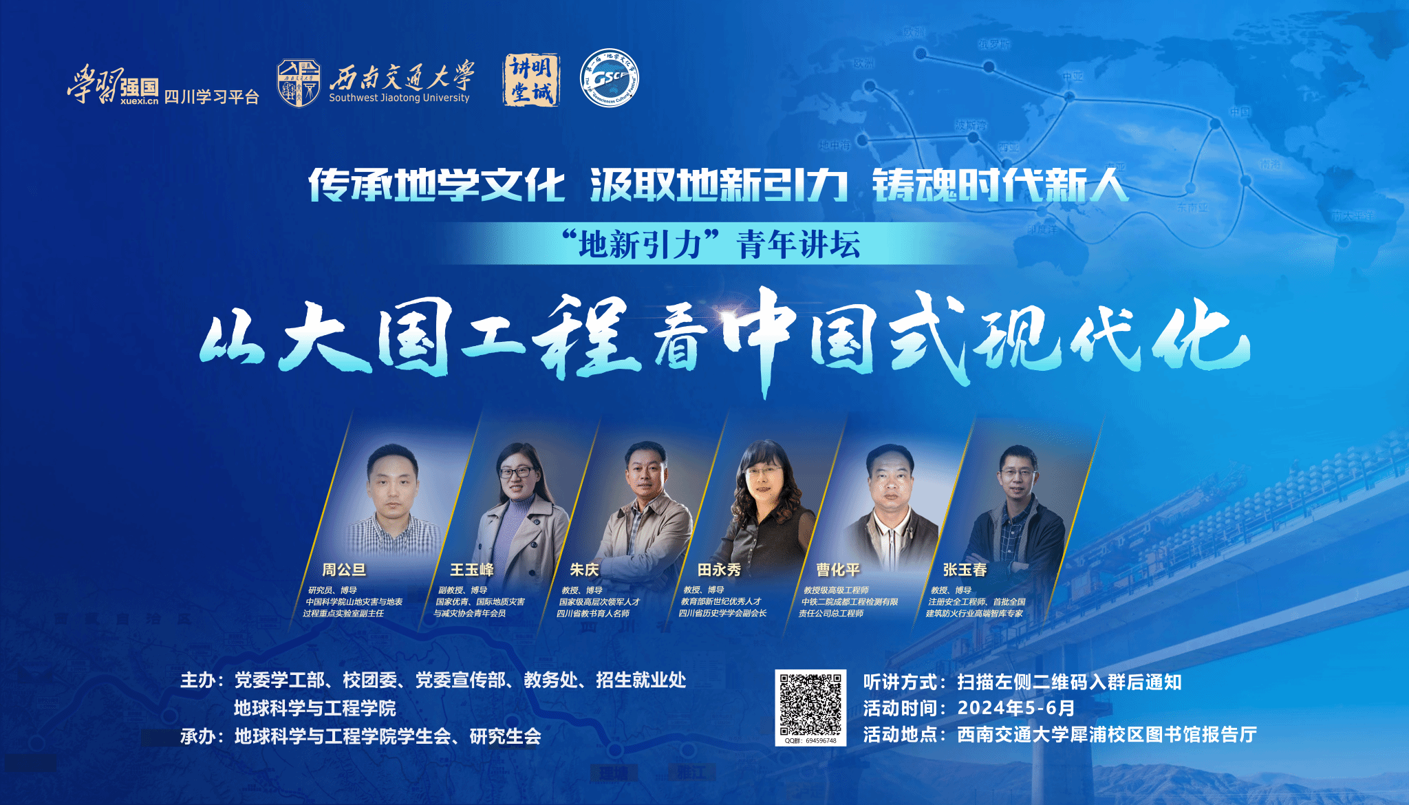 为学习宣传贯彻党的二十大精神,充分发挥公司轨道交通相关学科优势,引领广大青年员工将小我融入大我,以青春实践奉献祖国,在新时代新征程中奋勇争先建功立业,使青年一代在大国工程一线受教育、长才干、做贡献。BEATS在“学习强国”四川学习平台、党委宣传部、党委学工部、校团委以及教务处的支持下,邀请了大国工程一线以及思想政治教育与人文社科领域的专家、学者、教授为主讲嘉宾,通过“地新引力”青年讲坛的方式,为青年员工解惑授业、增知识、长才干,号召广老员工立志做有理想、敢担当、能吃苦、肯奋斗的新时代好青年。2024年4月25日,“地新引力”青年讲坛——“从大国工程看中国式现代化”开讲仪式暨地学文化节开幕式即将开始,现就相关通知如下: