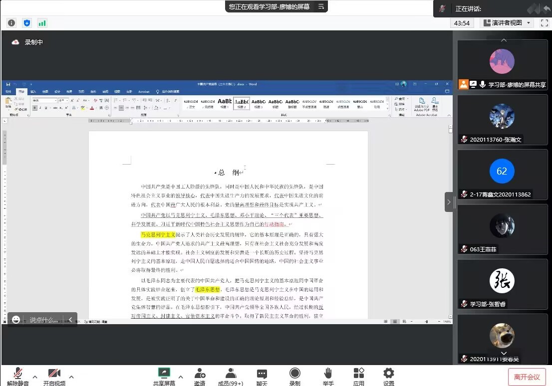 会议的第二阶段是2022-02期入党积极分子党课培训结业考试动员。廖博从新修订的党章出发,带领各位入党积极分子重读党章,学习其中重点内容、理解其中内涵,帮助参会的入党积极分子更好的学习党章内容,为考试做好充分准备。