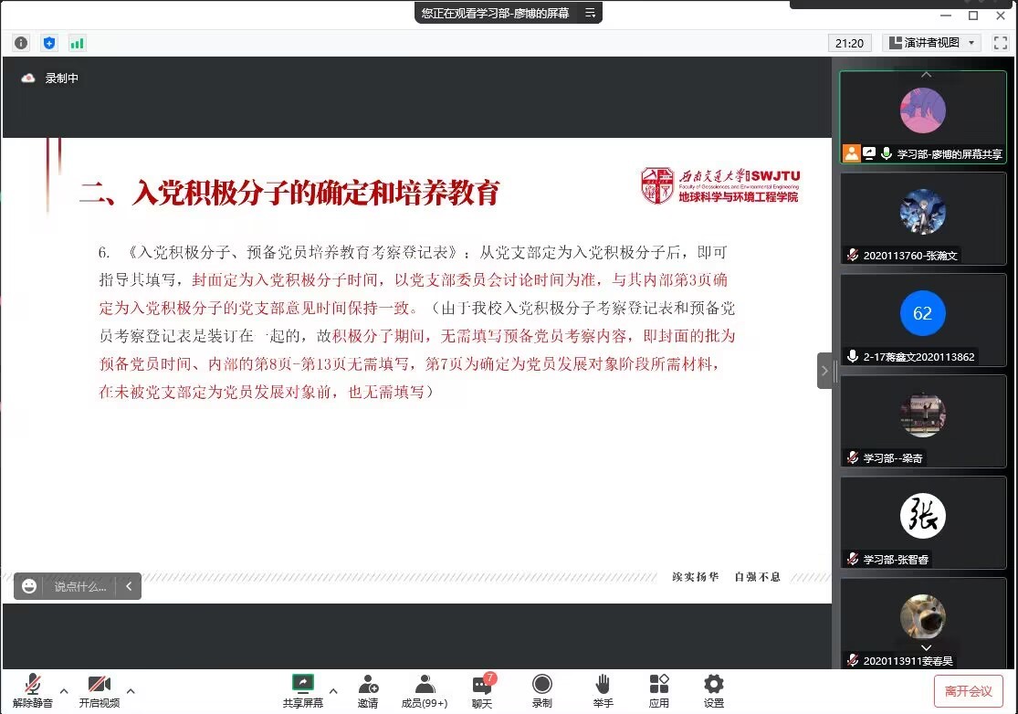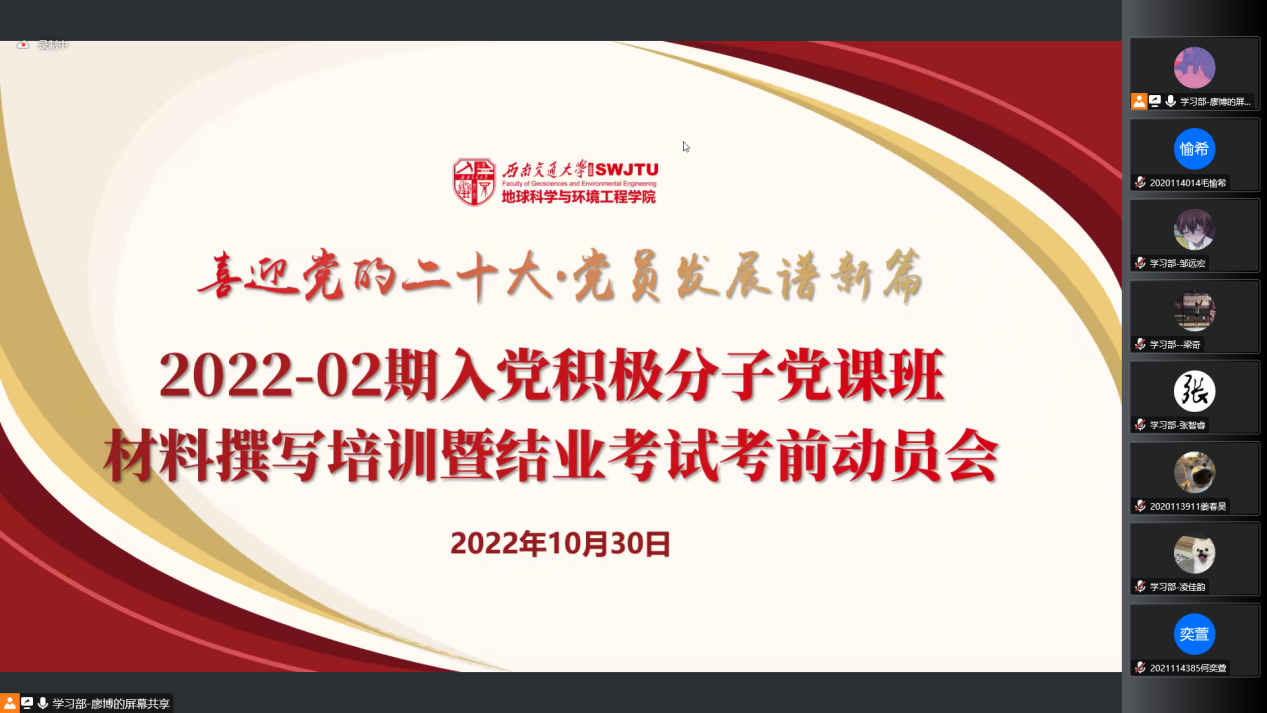 本次会议一方面解答了入党积极分子在入党材料方面的疑难问题,使大家对入党流程有了进一步的理解;另一方面,也为即将开展的2022-02期入党积极分子党课结业考试做了准备工作,为培训学员指明了复习方向。