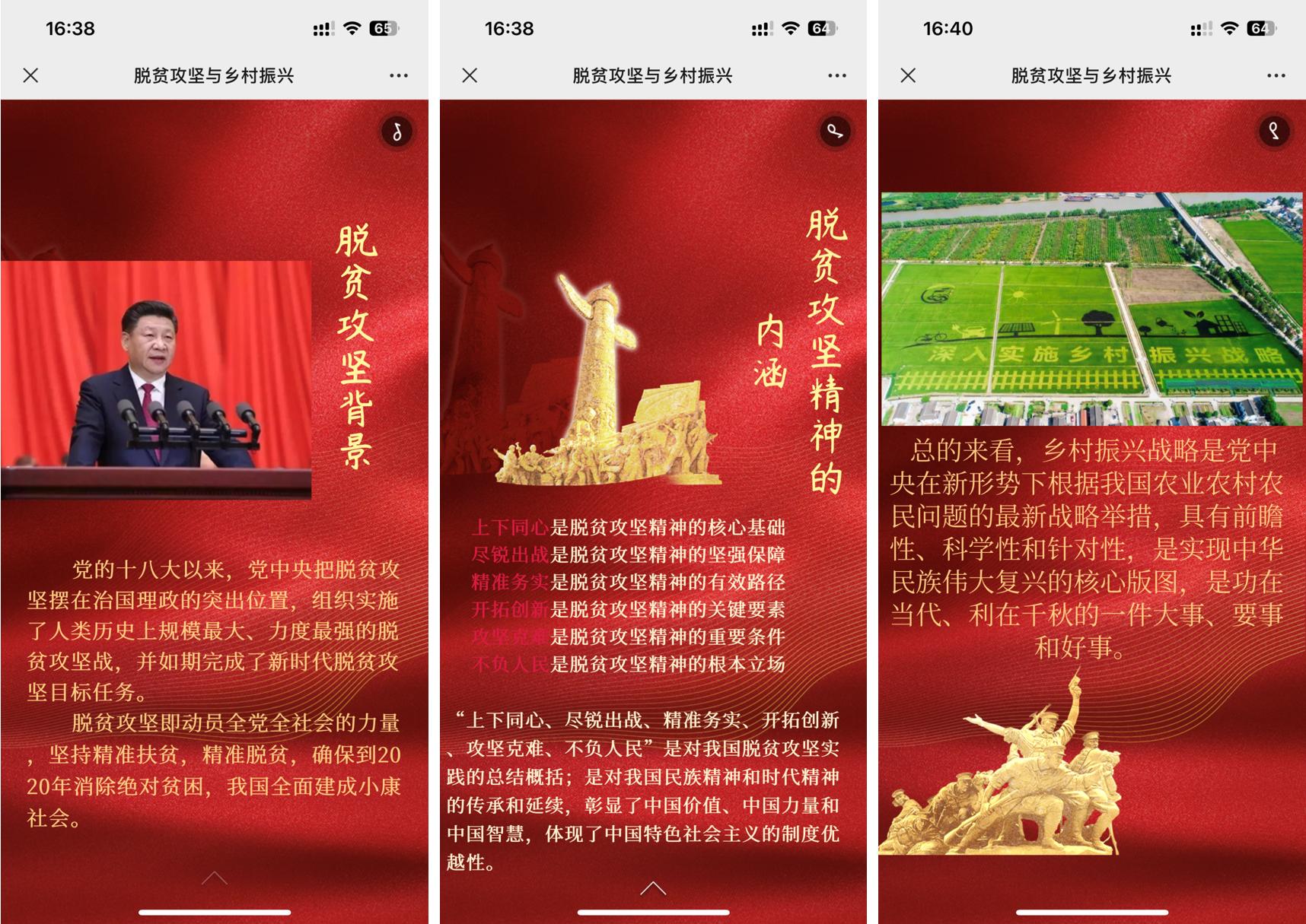 党的十八大以来,以习近平同志为核心的党中央把脱贫攻坚摆在治国理政的突出位置,作为实现第一个百年奋斗目标的重点任务,纳入“五位一体”总体布局和“四个全面”战略布局,作出一系列重大部署和安排,全面打响脱贫攻坚战。第十三组学员收集了丰富的资料制作了H5作品,详细介绍了脱贫攻坚及乡村振兴的政策和伟大成果,就脱贫后乡村振兴如何衔接以及下一步该怎么做等进行了深入的讨论。