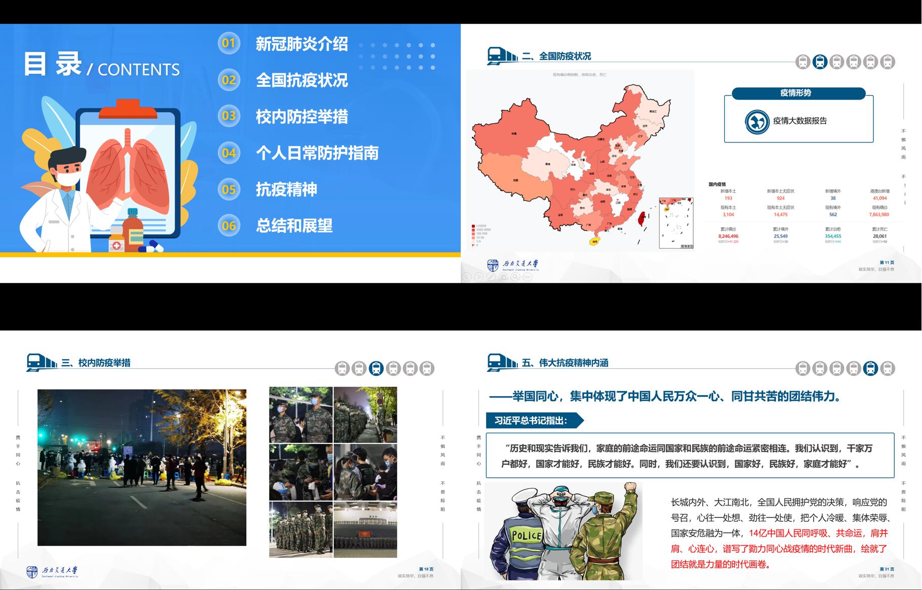 自2020年以来,我们便开启了“同舟共济战‘疫’记”,从国家坚持“动态清零”不动摇到公司积极响应配合,我们每一个人都参与到这场行动中万众一心。在这场殊死较量中,中国人民和中华民族以敢于斗争、敢于胜利的大无畏气概,铸就了生命至上,举国同心,舍生忘死,尊重科学,命运与共的伟大抗疫精神。第十五组学员制作了PPT作品向大家介绍了疫情的发展、全国疫情状况以及个人防护措施等,弘扬了伟大抗疫精神、分享了自己的切身感受,深刻体会到疫情下中国特色社会主义制度的优越性。
